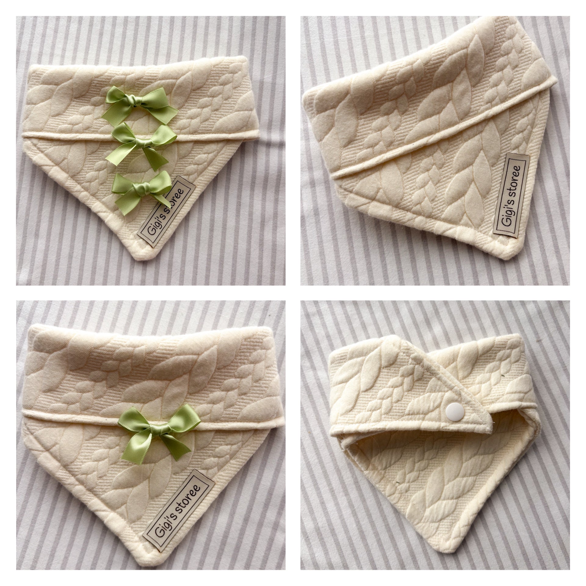 A cream knit clip on bandana with the option of green bow ties.