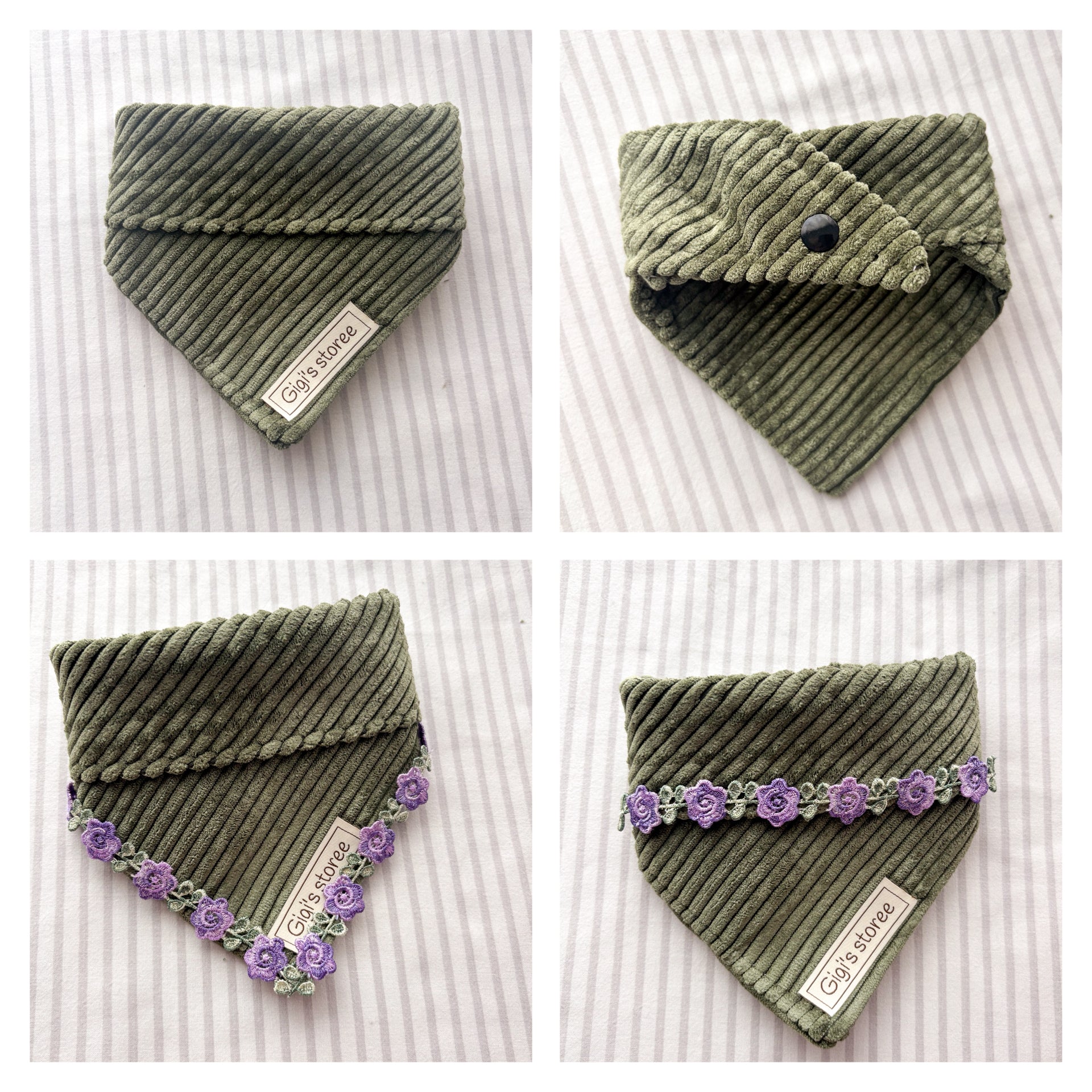 A handmade clip on bandana. Available with or without purple flower vines.
